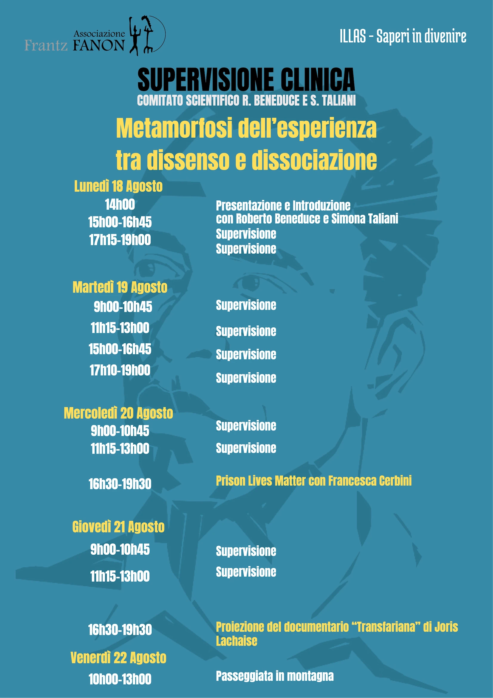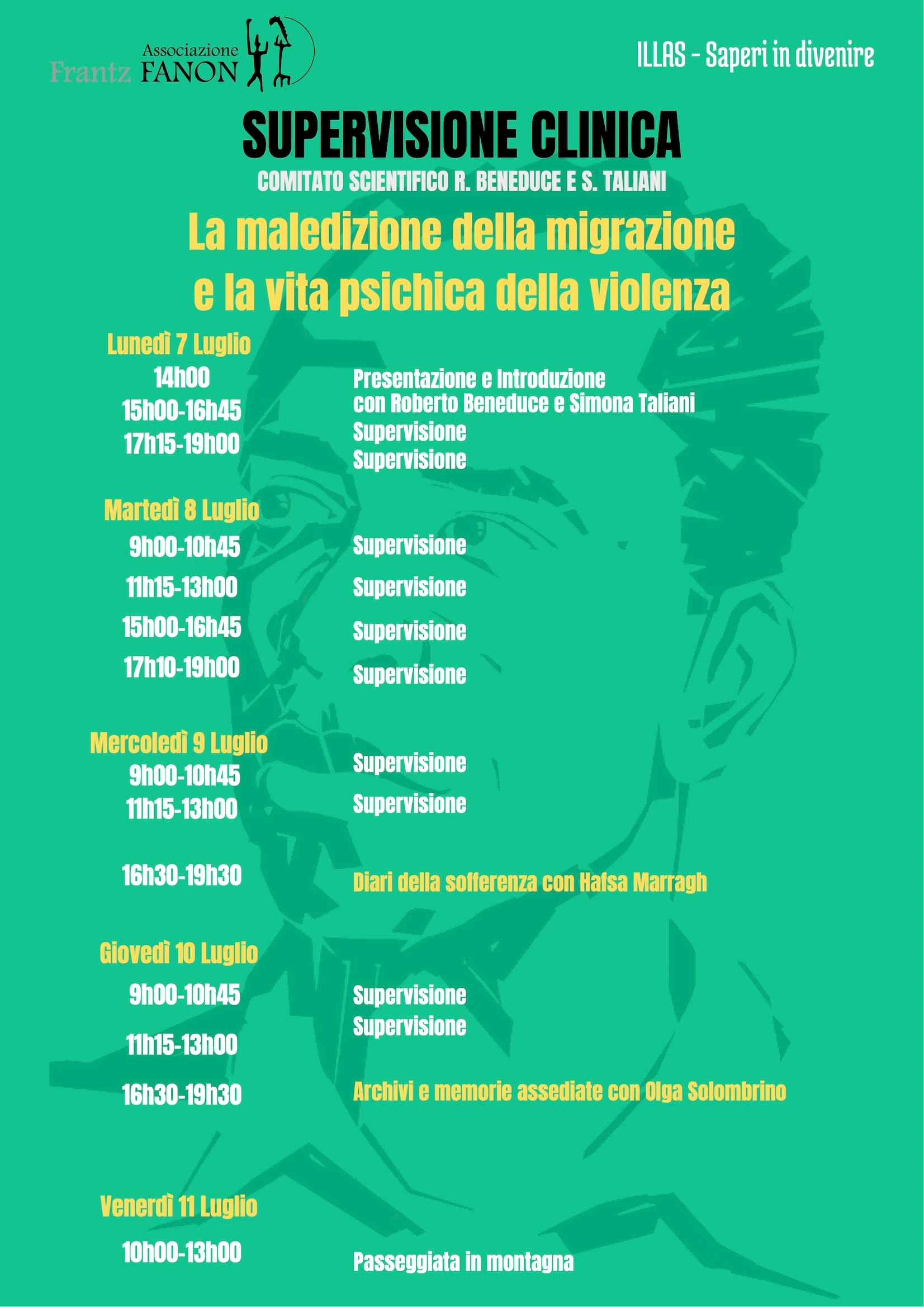 Supervisioni: durante la settimana (dal lunedì al giovedì) si terranno supervisioni cliniche e etnografiche su casi- studio scelti dai partecipanti stessi. Ciascuno è invitatə a presentare un incontro (clinico o etnografico) da discutere in gruppo e rielaborare con l’accompagnamento di Simona Taliani e Roberto Beneduce. Il materiale verrà fatto circolare con alcuni giorni di anticipo. Il mercoledì e il giovedì prevedono dei momenti dedicati all’incontro con un ospite, per approfondimenti tematici. Venerdì è la giornata dedicata a una passeggiata in montagna.